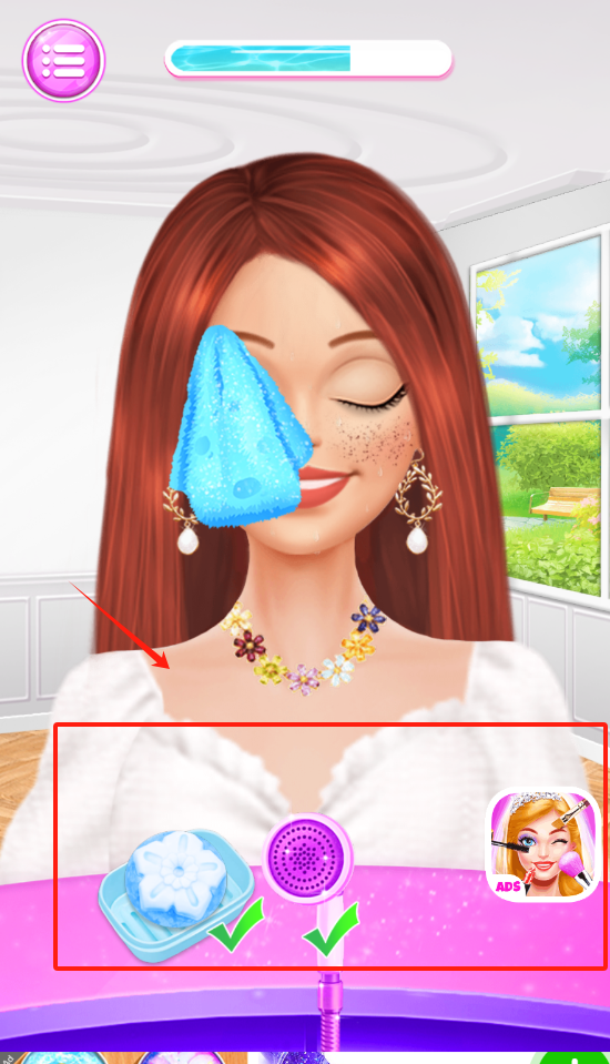 3、美容游戏操作界面,红发女孩闭眼擦脸。底部粉色栏有美容工具,中间喇叭可播放音乐,进度条显示任务完成情况。