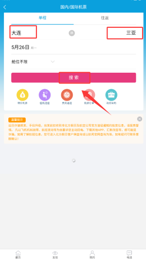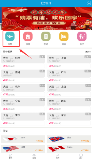 1、启动北方假日APP后,在首页导航栏选择"机票"功能,进入航班查询页面。