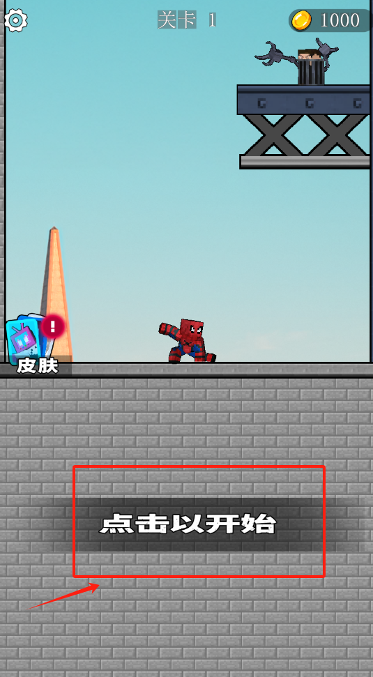 1、点击以开始按钮进入游戏,看到红方块小人在蓝天背景下的灰色砖墙边准备战斗。