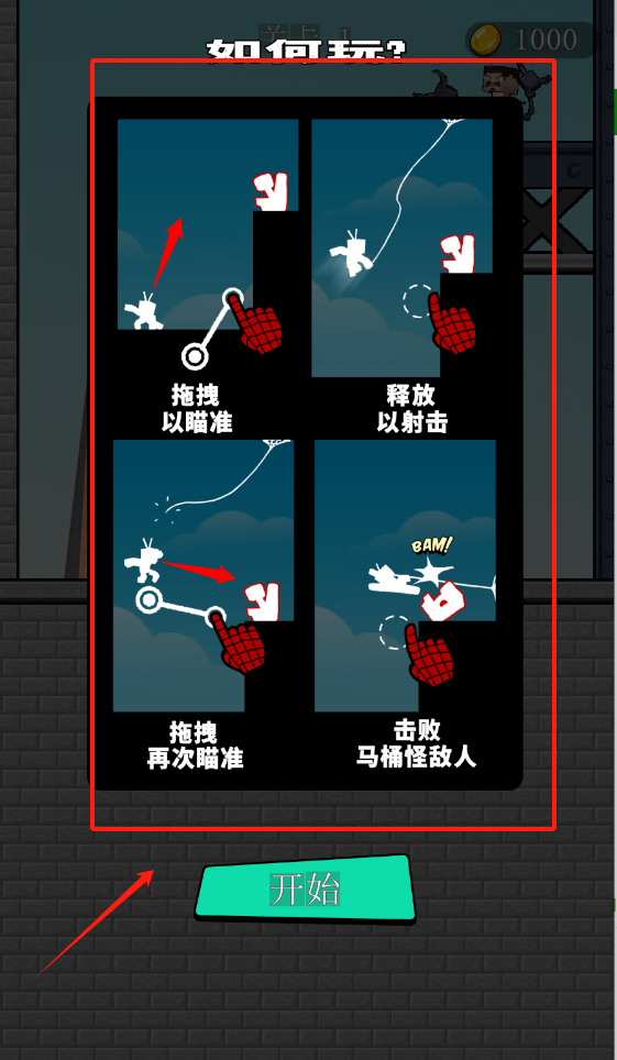 2、圆环瞄准敌人后释放射击,击中目标显示BAM,成功击败马桶怪敌人后点击开始。