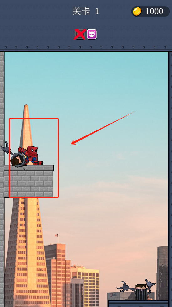 3、关卡1场景,控制红角色在楼顶边缘移动,准备应对城市建筑中的各种挑战和敌人。