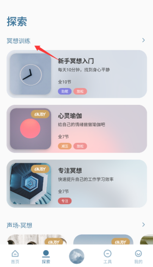 1、进入ASMR助眠白噪音APP后,在首页选择"探索"板块,这里提供多种冥想训练课程。