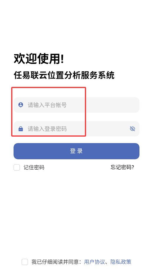 1、启动任易联APP后,在登录页面输入已注册的账号和对应密码进行验证。