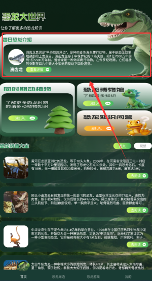 1、包含了丰富多样的恐龙知识,用户可以随时在线阅读,涵盖多个板块,不仅能学到有趣的知识,还能开阔自己的视野。