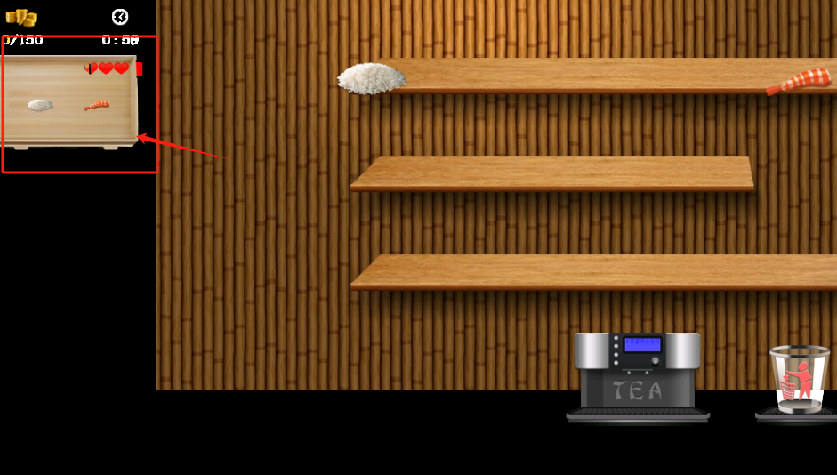 2、游戏里用架子上的米饭和虾做寿司,注意左侧任务和右上角的分数、时间,茶机可以泡茶。