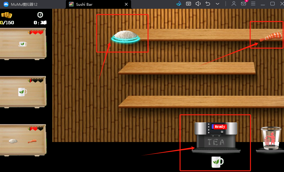 3、架子上拿材料做寿司,茶机显示Ready就能接茶,看着左侧任务和分数,时间别超时。