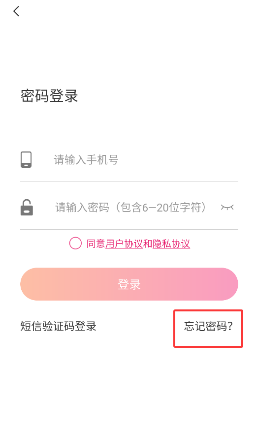 1、在APP登录页面点击"忘记密码"选项,系统将跳转至密码重置界面。