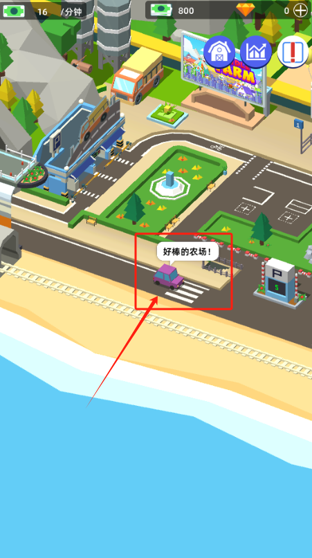 1、点红框里的好棒的农场提示,查看农场收益每分钟16金币,当前有800金币。