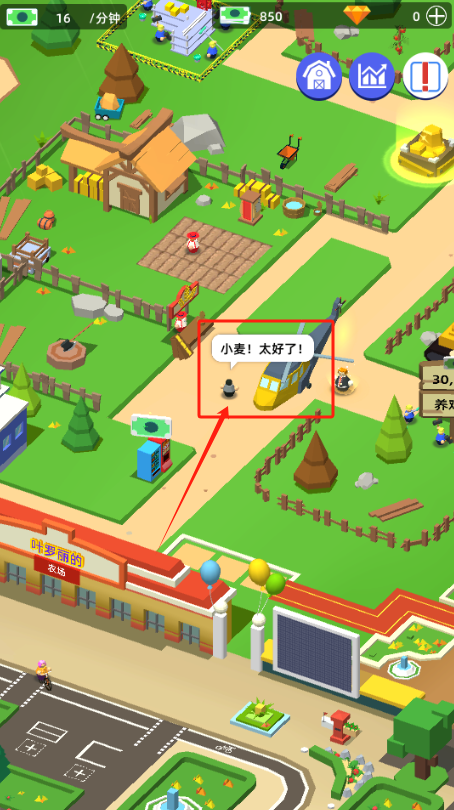 2、看黄色小车喊小麦太好了,左上角显示每分钟赚16金币,现有850金币。