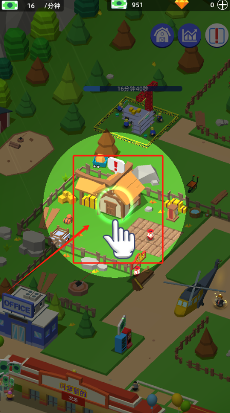 3、点红圈里的房子升级,看上方每分钟赚16金币,现有951金币,倒计时16分40秒。
