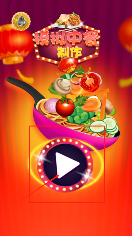 1、点下方带光圈的播放按钮开始游戏,红灯笼背景上有模拟中餐制作几个字。