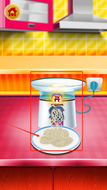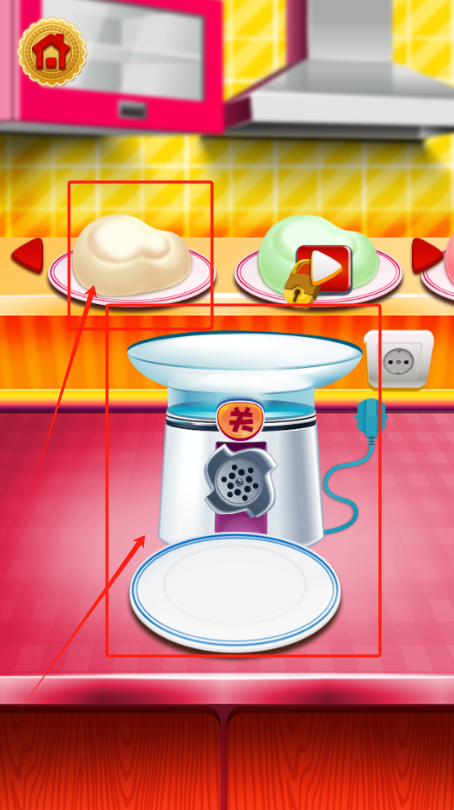 2、厨房里粉色台面有和面机,点白色盘子接住面团,旁边插座要插好电。
