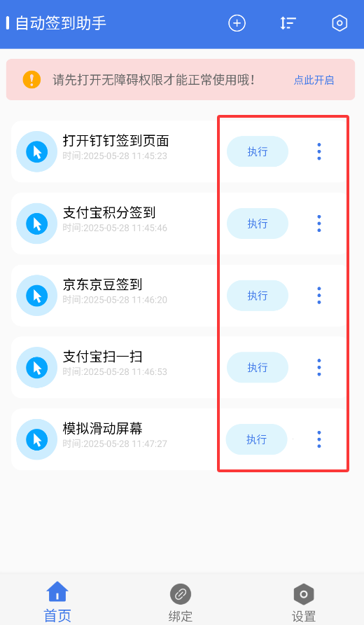 1、启动APP后,在权限管理界面开启必要权限(如无障碍服务),返回首页即可使用一键签到功能。