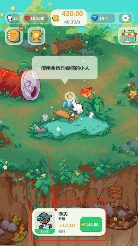 3、点升级花144金币把渔夫升到4级,收益能加12.1,现在有420金币。