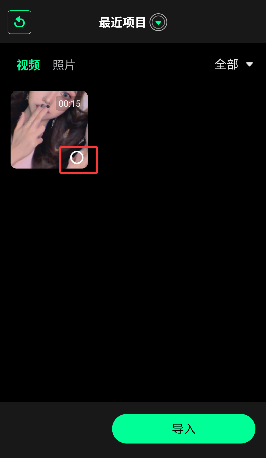 1、启动APP后,点击"新建项目"按钮,进入视频素材选择界面。