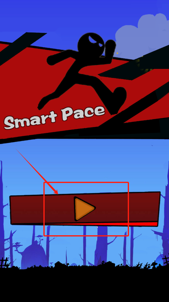 1、点中间的橙色播放按钮开始游戏,控制黑色小人跑酷闯关,注意避开障碍物。