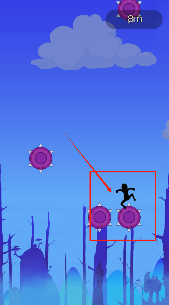 3、控制小人在紫色圆盘上跳跃移动,注意避开带刺的障碍,8m是当前跑动距离。
