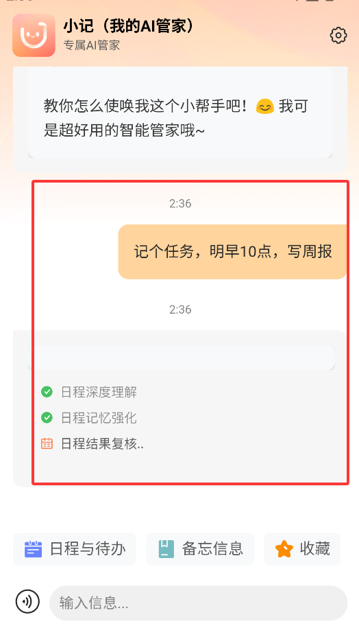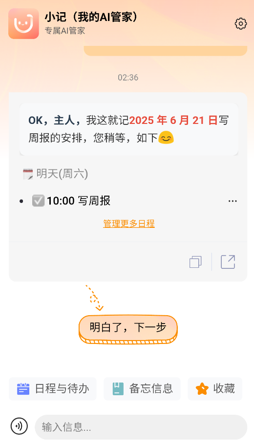 2、对AI说出指令如“明早10点写周报”,系统会自动识别时间、事件类型并生成待办清单。