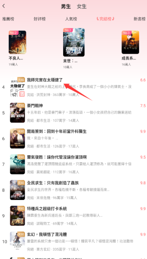 2、浏览榜单时,可通过分类标签或评分筛选,快速找到心仪的完结小说点击封面。