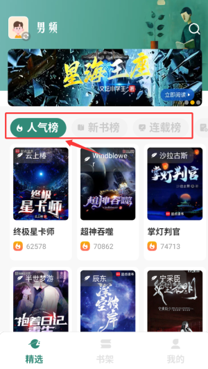 1、进入海浪书屋APP后,在首页推荐或分类书库中浏览,选择感兴趣的小说点击封面。
