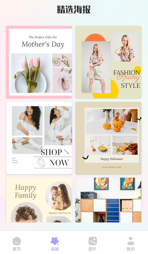 2、进入“海报模板”库,挑选商务、节日等风格,替换文字和图片生成专属设计。
