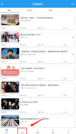 1、启动双语新闻APP后,在首页左下角找到并点击"视频"栏目入口。