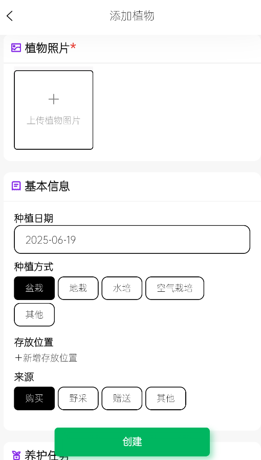 3、添加植物时,需拍摄或上传植物照片,填写名称、品种等基本信息,还能设置浇水提醒等养护任务。