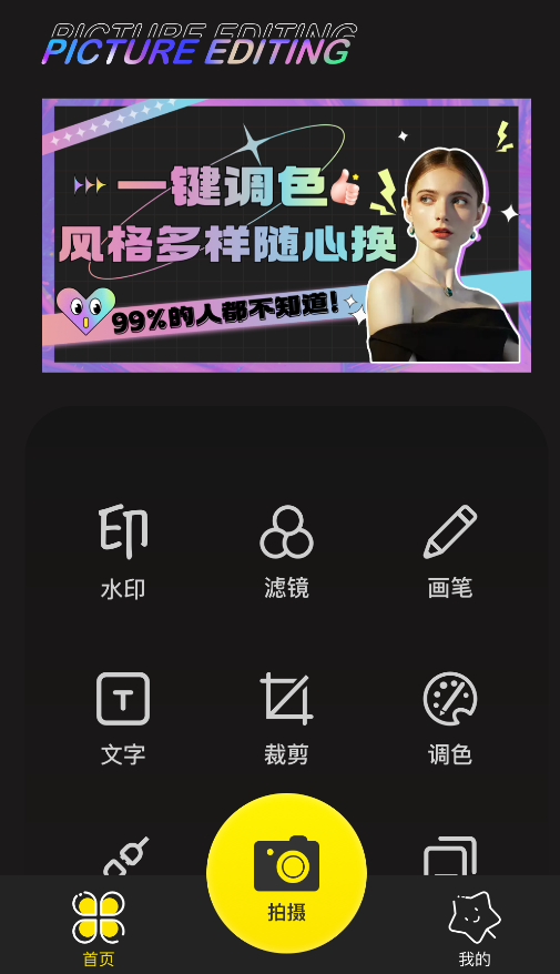 1、打开应用后,首页提供多功能入口:智能水印(时间/地点)、专业滤镜(50+款)及基础编辑(旋转/裁剪),点击即可使用。