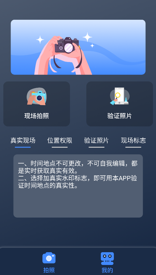 1、打开应用后,首页提供两种拍摄模式:"现场取证"(带防篡改标识)和"验证拍照"(自动生成唯一识别码),根据需求选择。