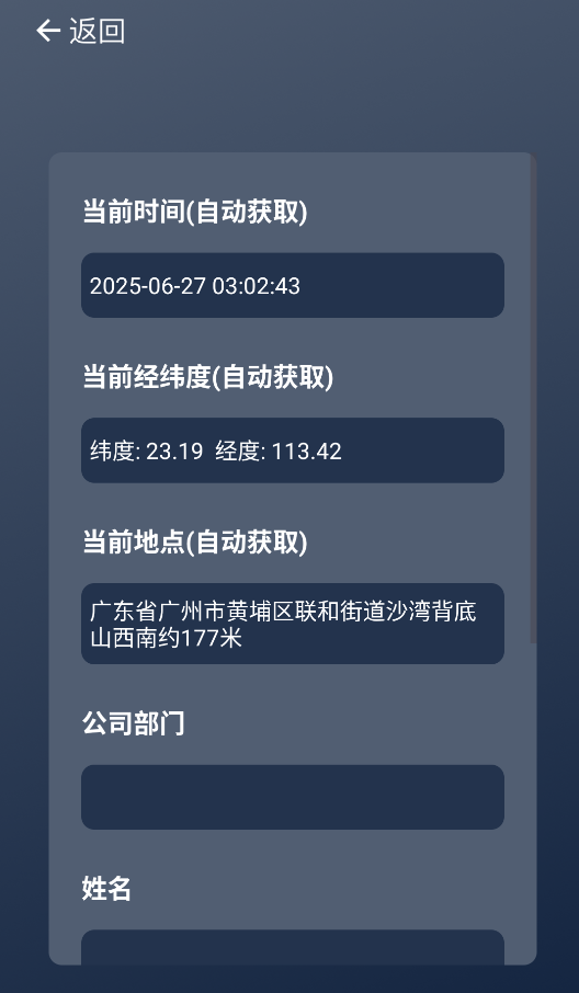 3、以"上班打卡"为例:拍摄后自动嵌入时间戳(精确到秒)、GPS坐标(可隐藏)、定位地址,仅需手动填写公司/部门/姓名即可生成不可修改的考勤凭证。