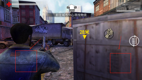 2、左侧是控制移动的虚拟摇杆,右侧设有开火、跳跃等按钮,界面左上角显示当前生命值与弹药情况。