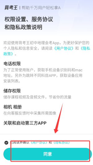 1、首次使用时需仔细阅读服务条款并勾选同意选项,完成初始设置后即可进入学习界面。