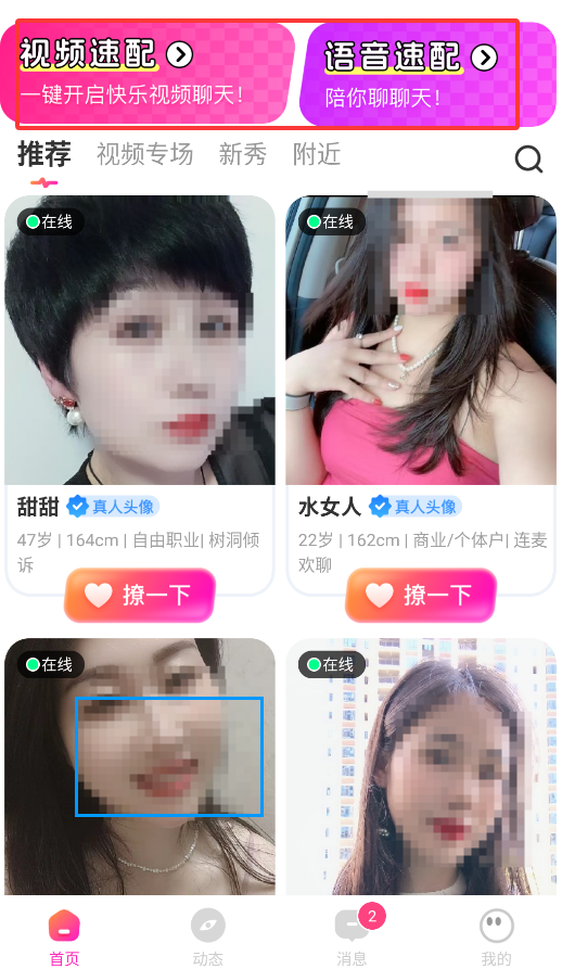 1、打开应用后,首页提供两种快速社交模式:15秒视频速配(实时美颜)和匿名语音速配(声纹匹配),系统会基于兴趣标签推荐高匹配度用户,点击"撩TA"即可发起对话。