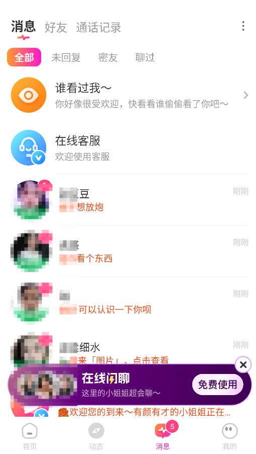 3、消息中心分类显示未读消息、好友申请及历史通话记录,长按对话可设置置顶或消息免打扰。