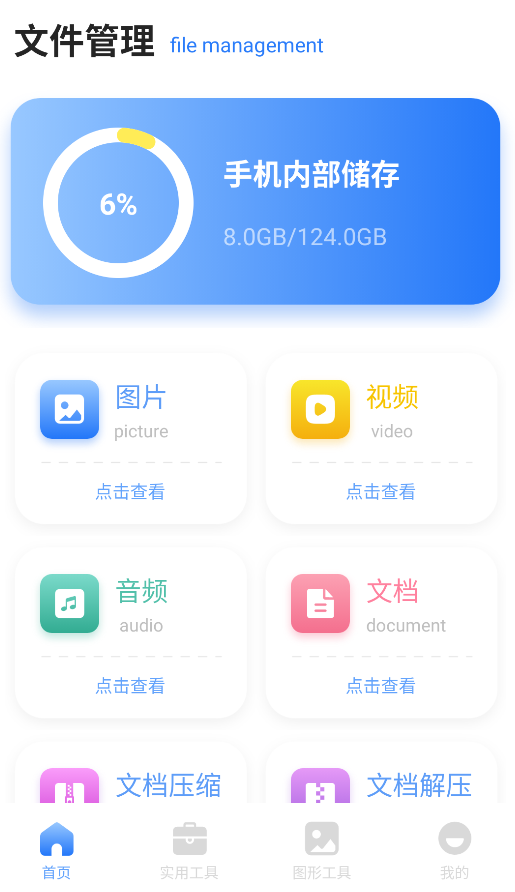 1、打开应用后,首页直观展示手机存储空间分布,支持按图片、视频、文档等分类快速查找文件,批量管理更高效。