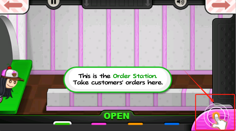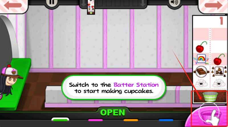 2、戴帽女孩是顾客,点右下OPEN按钮接单,按她要求准备蛋糕。