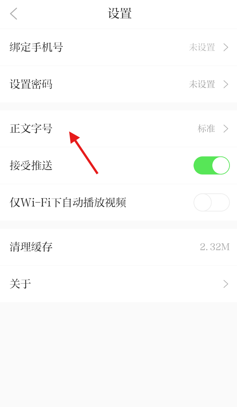 3、在设置界面中,寻找到 “正文字号” 选项,点击进入字号调整页面。