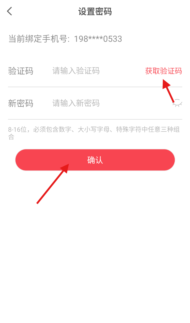 4、获取手机验证码并正确输入,接着填写新密码,确认无误后再次点击确认完成设置。