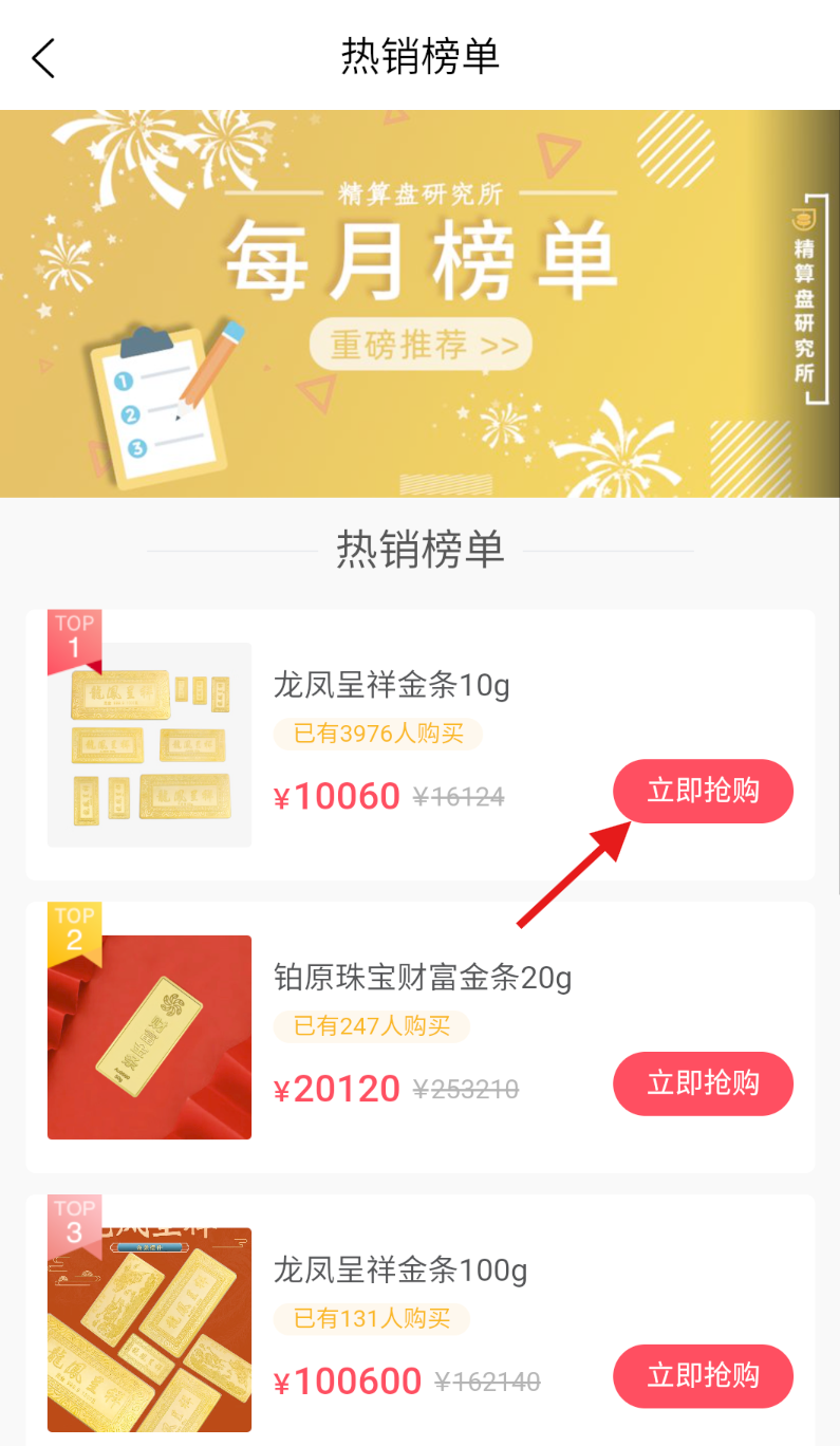 2、进入热销榜单页面后,浏览心仪产品,点击目标产品旁的 “立即抢购” 按钮。