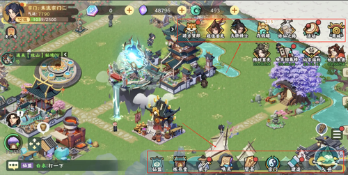 2、左侧为地图查看与建筑操作区域,右侧则是弟子管理、任务领取与修炼功能按钮,便于快速切换使用。