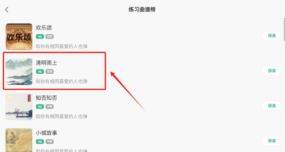 2、进入练琴页面后,满满都是曲子,挑一首自己想练的,点一下 “练习” 按钮。