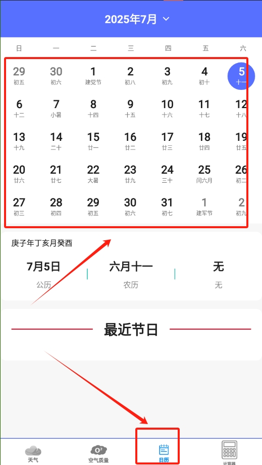 2、点击底部的日历图标,就能切换到日历页面,查看阴历阳历和节气。