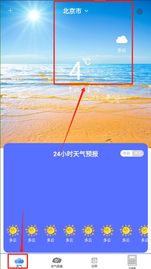 1、打开吉历天气预报软件,一进首页就能看到当天的天气预报,很方便查看。
