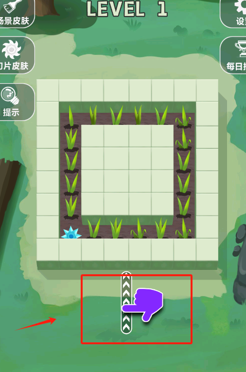 1、看到带箭头的紫色按钮,点它就能开始第一关游戏,在田地里种上绿植填满空缺处哟。