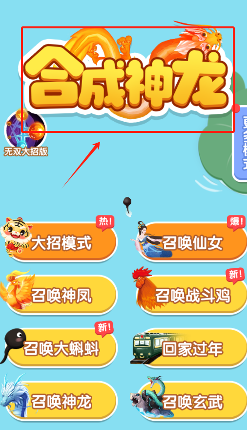 1、看到合成神龙大字和一堆彩色按钮,用手指点那个红色召唤神龙按钮就能开始合成神龙啦。