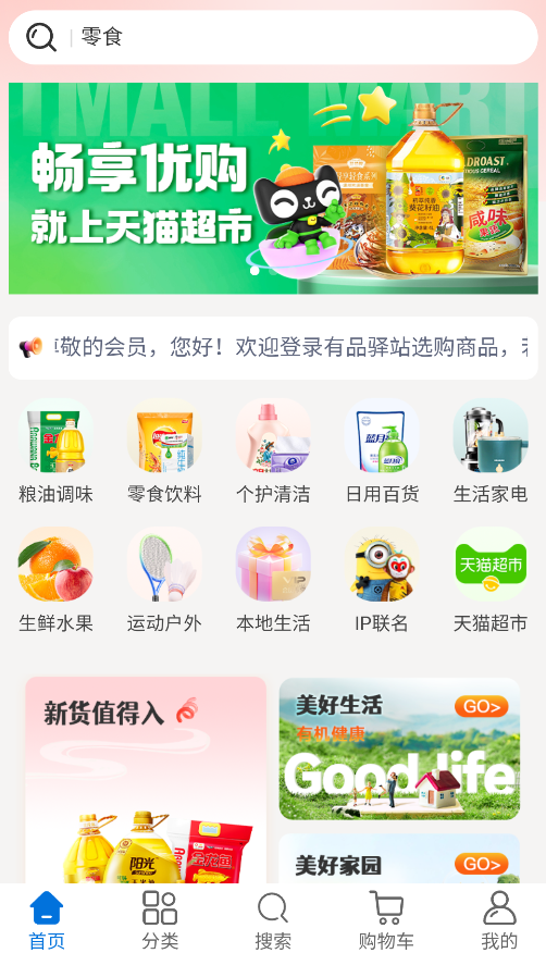 1、打开APP后,首页会智能推荐"畅享优购"、"新货值得入"等精选商品专栏,涵盖生活用品、家装饰品等各类商品。
