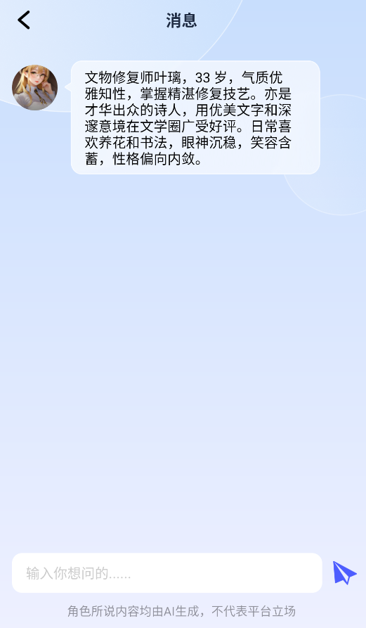 2、在聊天界面输入文字内容,系统会生成符合角色性格的智能回复。