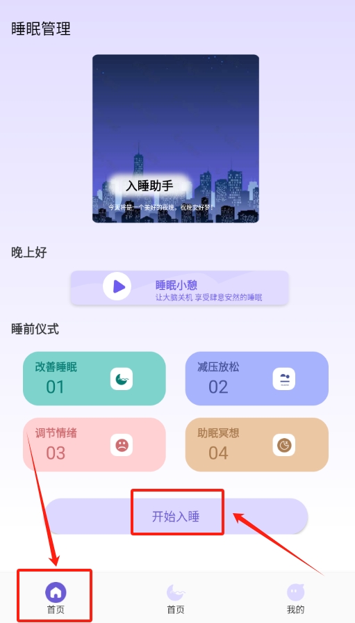 1、打开鼾声睡眠后,在首页上找到开始睡眠的按钮,直接点击一下,进入到睡眠准备的相关界面。