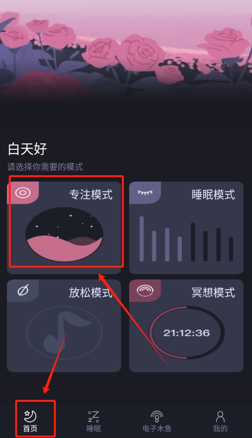 1、打开减压助眠神器后,在软件首页上找到专注模式的选项,直接点击进去,进入到专注模式的设置界面。