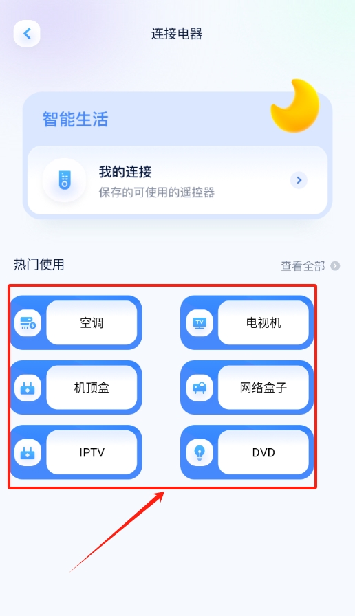 1、下载安装后打开,想连接智能家电在首页点设备连接,选择对应家电类型,确保在同一网络,点击连接等待配对成功。